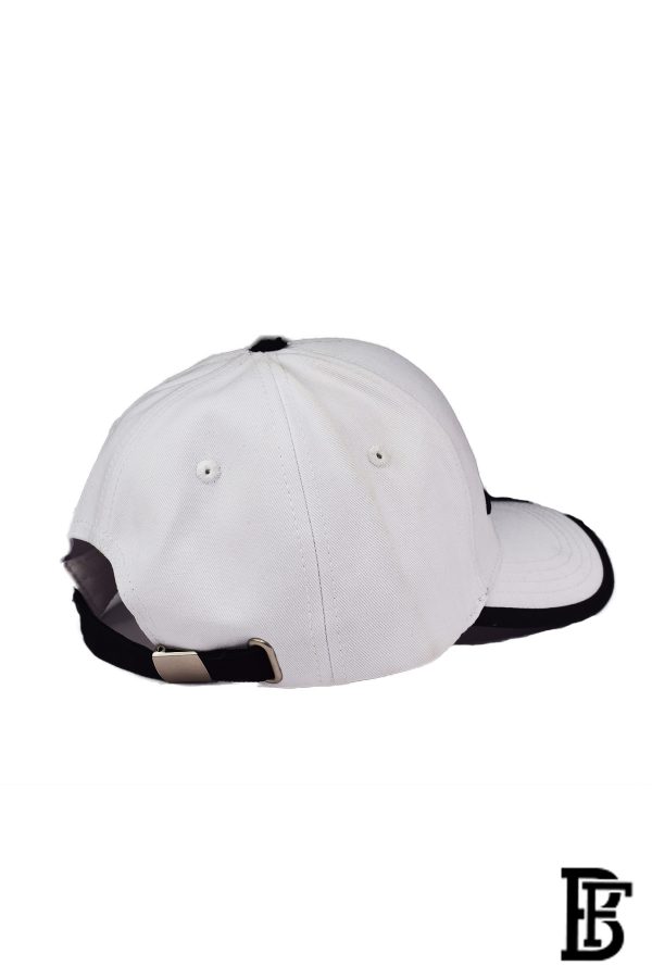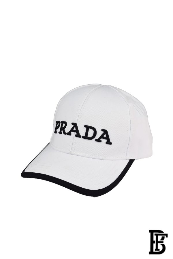كاب مستوحى من برادا باللون الابيض وخامة القماش بتصميم أنيق