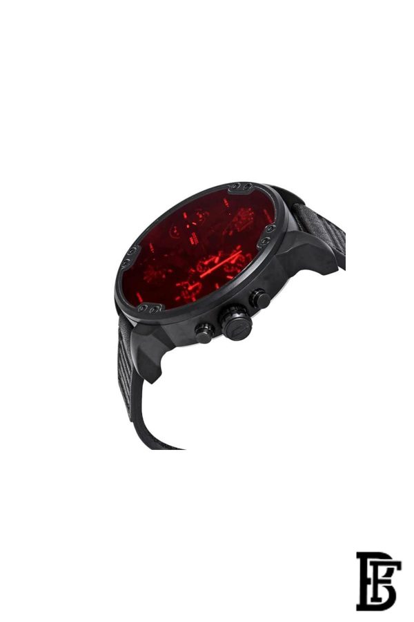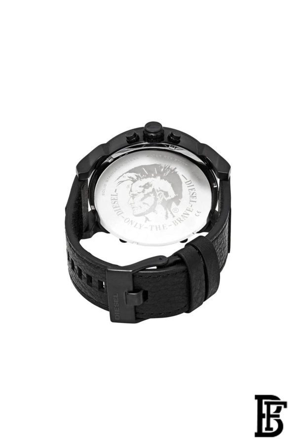 Commanding and stylish, the Diesel Mr. Daddy 2.0 watch showcases an insanely detailed textured black dial with red crystal lens. A black IP case and black leather strap complete the look.