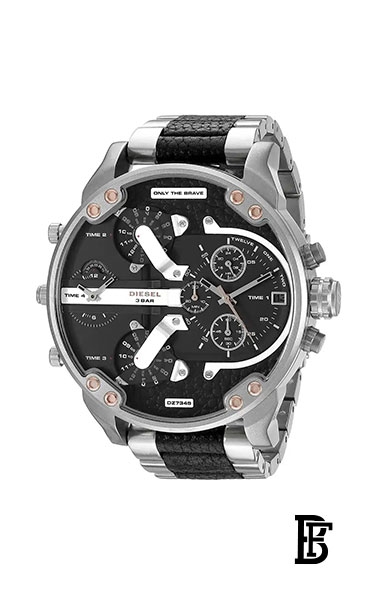 This Mr Daddy 2.0 Diesel DZ7349 men's watch features a black dial with silver tone hands and index hour markers, four time zone setting, date window display at 3 o'clock position. three chronograph sub dials for second, minute and hour. It is set on a stainless steel case and stainless steel bracelet with black leather center.