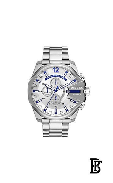 Commanding and stylish, this stainless-steel Diesel Mega Chief watch features a silver-tone chronograph dial with an "Only the Brave" tag and three-link bracelet.