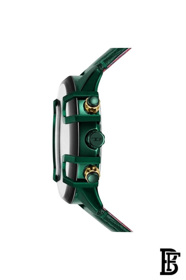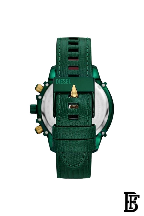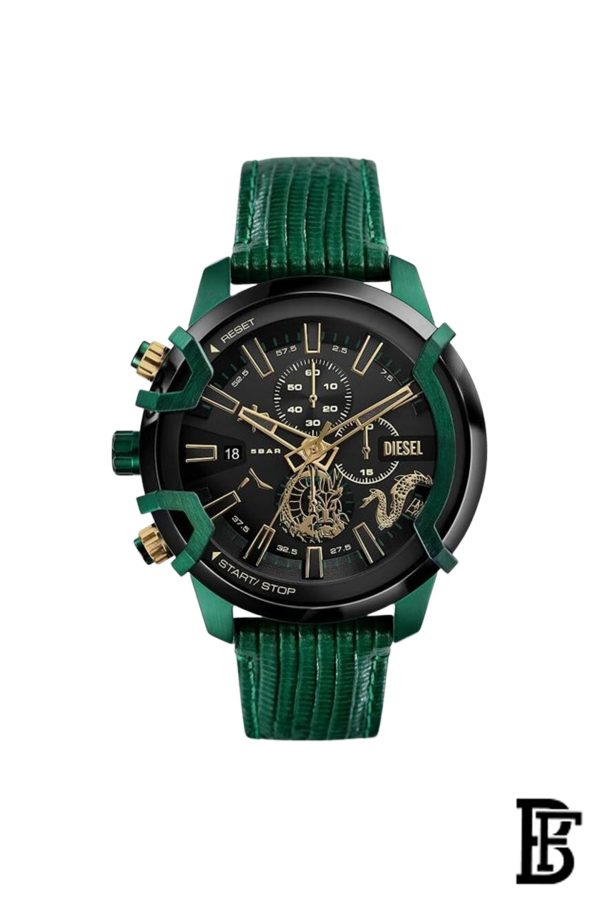 تتميز ساعة Griffed مقاس 48 ملم من ديزل بمينا أسود غير لامع وحركة كرونوغراف وحزام جلدي أخضر اللون.