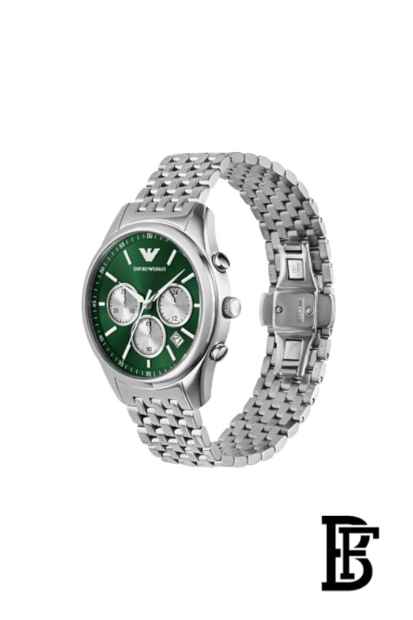The Emporio Armani Antonio Chronograph watch, model AR11581, blends modern design with everyday functionality. Featuring a bold green dial with the iconic Emporio Armani logo, this watch is powered by a precise quartz chronograph movement. Crafted from premium stainless steel with a silver bracelet, it offers a refined yet versatile look, perfect for men who appreciate style suitable for any occasion.