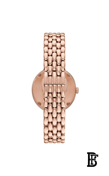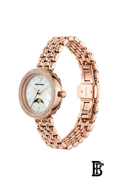 تتميز ساعة إمبوريو أرماني مقاس 32 ملم بمينا من عرق اللؤلؤ الأبيض اللامع وحركة أطوار القمر وسوار من الفولاذ المقاوم للصدأ بلون ذهبي وردي.