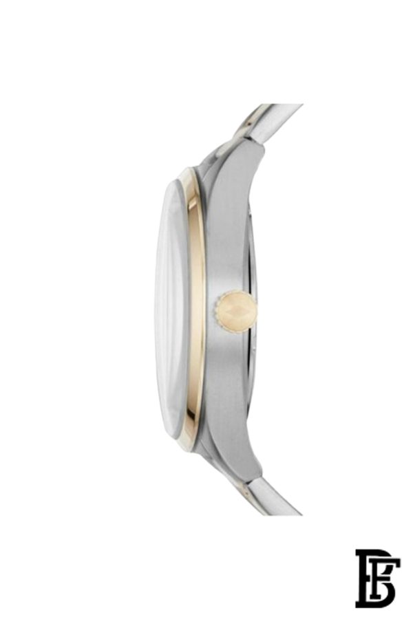This 44 mm Fossil features a textured sunray dial with stick indices, three-hand date movement and striking steel bracelet.