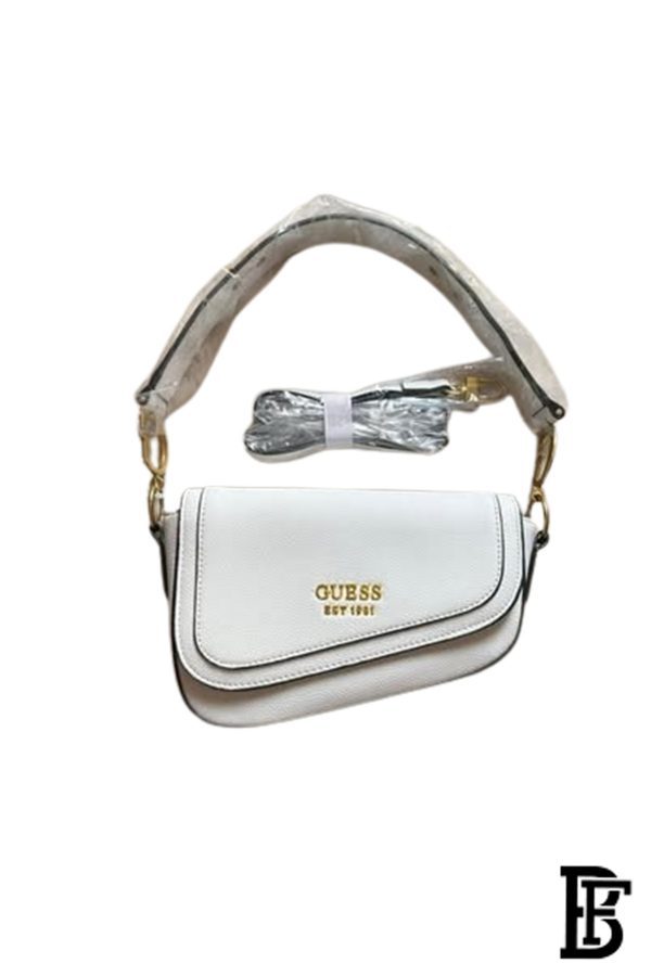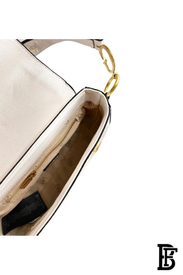 Add the ‘Danna’ saddle bag from GUESS to your handbag collection. This New Season style is crafted from premium PU with brushed gold tone hardware. The secure magnetic snap front flap reveals the logo lined main compartment and features handy inner pockets. Exterior zip pocket also features. Carry by the detachable shoulder strap or the detachable cross body strap. Classic ‘G’ logo adds detail. Signature GUESS branding is seen throughout.