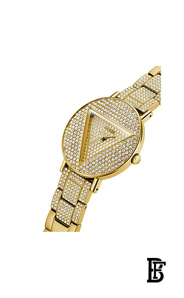Iconic in everyway, this dazzling style has a triangle dial inset with full glitz and is paired with a sleek partially glitzed bracelet
