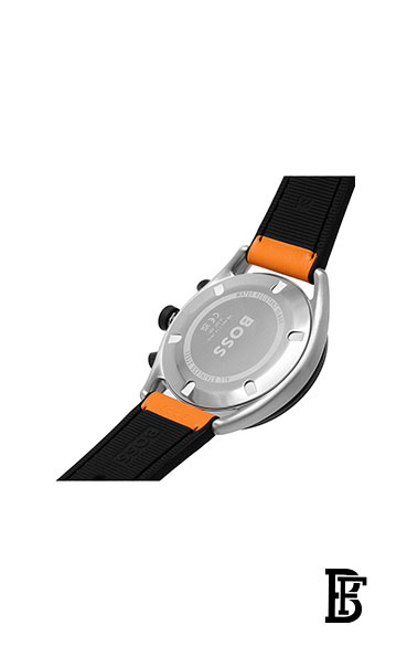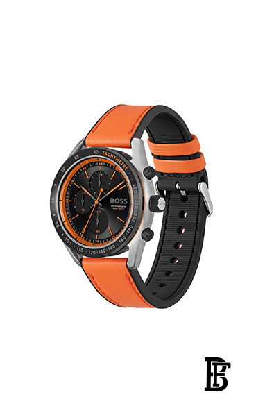 كرونوغراف BOSS للرجال من عائلة سنتر كورت. تتميز بعلبة من الفولاذ المقاوم للصدأ مقاس 44 ملم وقرص أسود وحزام جلدي برتقالي مع سيليكون أسود. مقاومة للماء حتى 10ATM