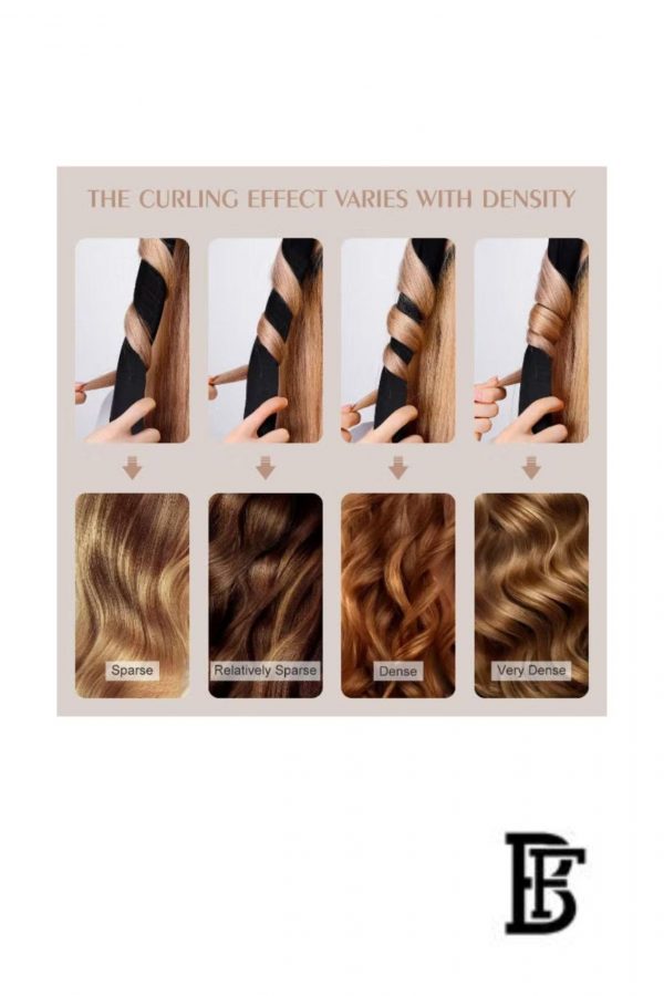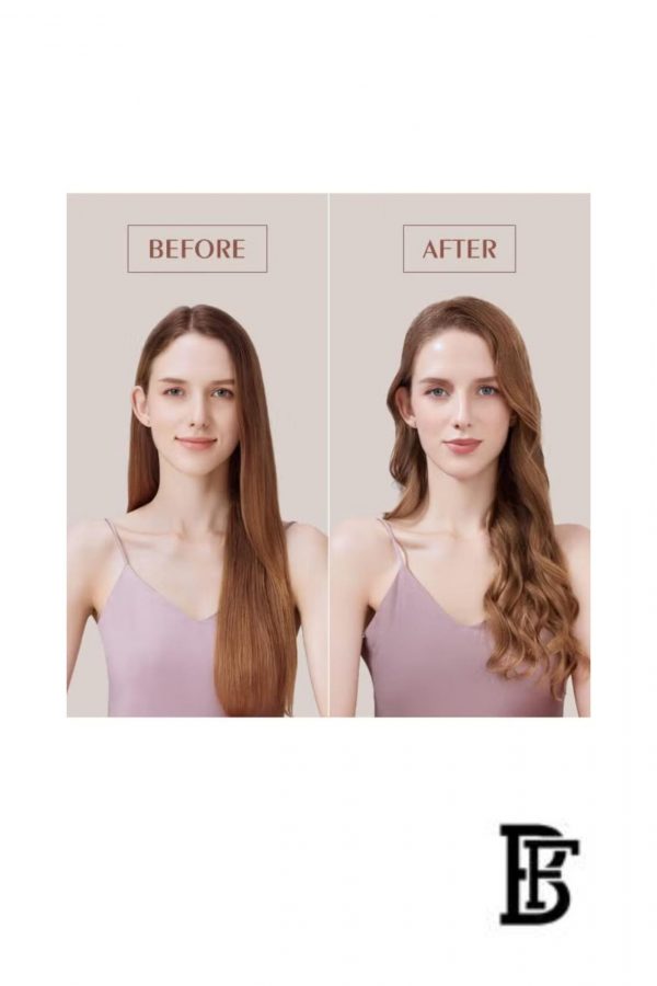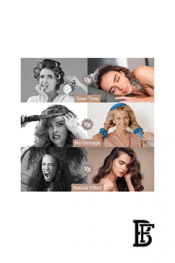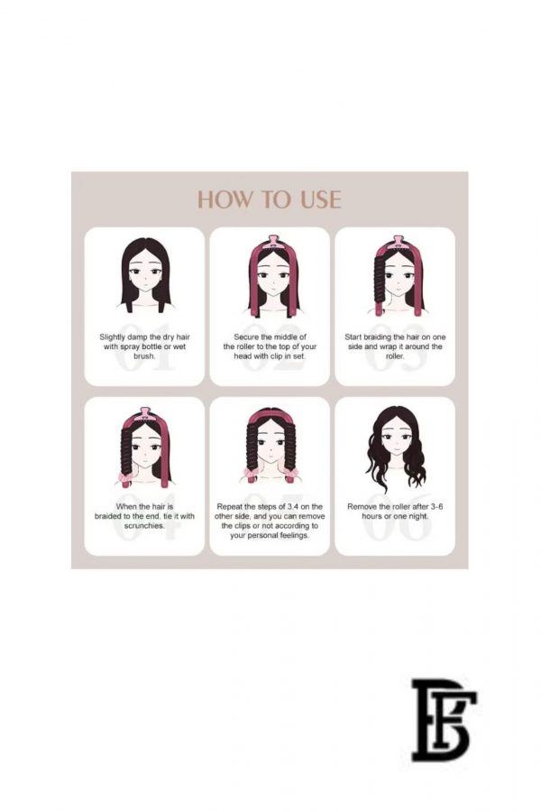 Place the curling iron on your head and secure it with a clip (hair is slightly damp). Wrap your hair around it, section by section, secure the ends with a silk hair tie, and repeat on the other side. Wait 3 to 6 hours, or even sleep overnight, for gorgeous curls! Remember to hand wash your hair with cold water after use, do not wring it, and let it air dry. Do not bleach.