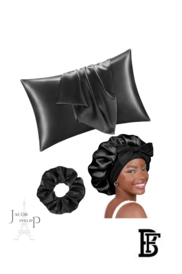 جاكوب وفيليب. استمتعي بشعر صحي مع هذه المجموعة النسائية من الساتان اللامع، لمسة من الأناقة والنعومة. تتميز هذه الوسادة الأنيقة من الساتان برباط شعر من الساتان وغطاء رأس أسود من الساتان بطبقة واحدة.