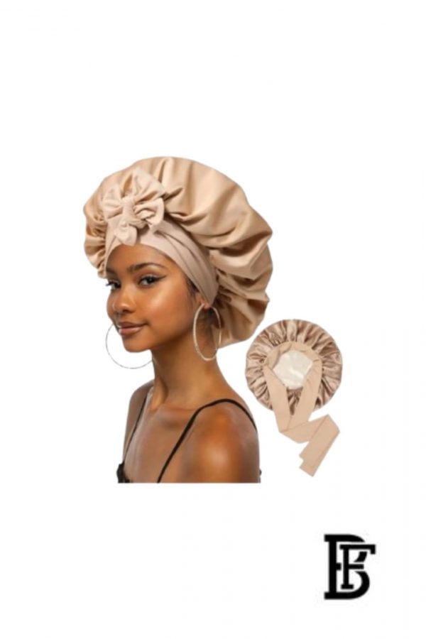 Jacop&Philipp Night Satin Elegance A piece of luxury and softness Elegant Satin Bonnet Set for Women Single Layer Satin Bonnet for Curly Hair with Satin Hair Ties and Long Bow Clips in Beige