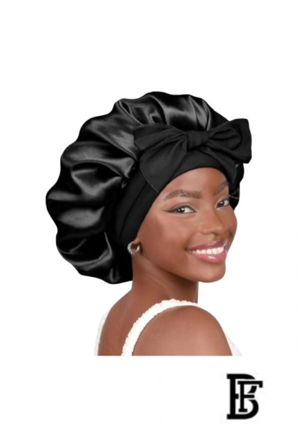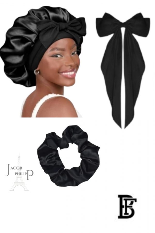 Jacop&Philipp Night Satin Elegance A piece of luxury and softness Elegant Satin Bonnet Set for Women Single Layer Satin Bonnet for Curly Hair with Satin Hair Ties and Long Bow Clips in Black