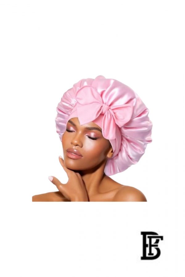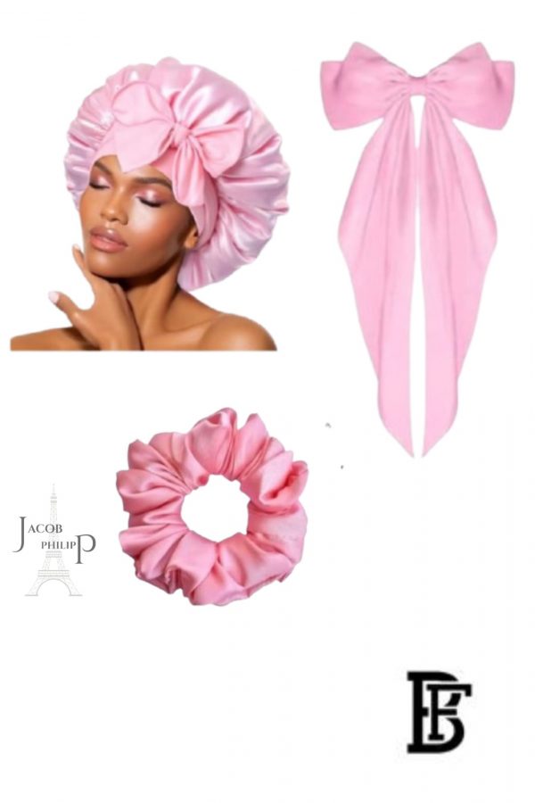 Jacop&Philipp Night Satin Elegance A piece of luxury and softness Elegant Satin Bonnet Set for Women Single Layer Satin Bonnet for Curly Hair with Satin Hair Ties and Long Bow Clips in Pink