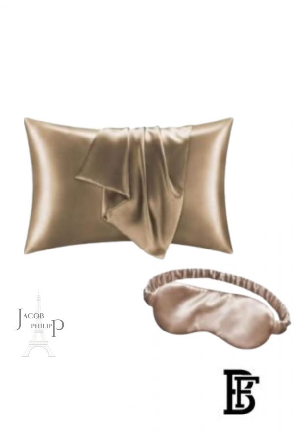 One satin pillowcase and one silk eye sleep mask with elastic strap for sleeping, traveling, and napping. Soft beige eye mask. Prevents sleep lines on your face that can turn into deep wrinkles. Protects your skin. It's an ideal cover for curly and dry hair.