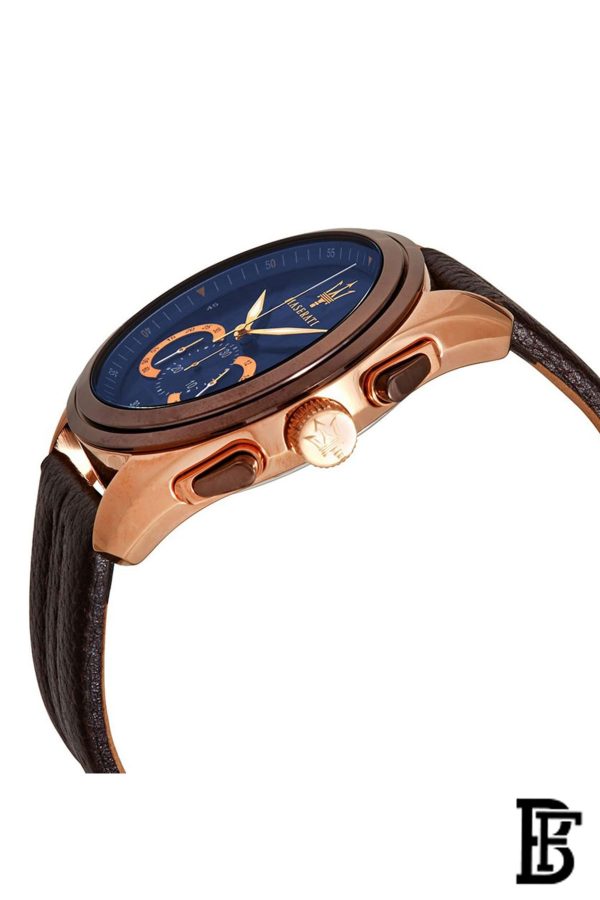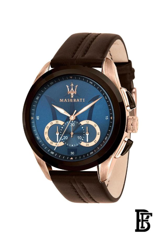 Men's Maserati watch R8871612024, from Traguardo Collection, with MOV.JS50 H6 movement, chronograph quartz watch with only time function. The stainless steel round case measures 55 x 45 mm equipped with a mineral crystal. This wrist watch, from Maserati Traguardo Collection, features a blue dial and a leather brown strap with buckle closure. Water resistant up to 10 ATM. The watch comes in its Maserati original box, also containing the 2 year warranty.Men's Maserati watch R8871612024, with MOV.JS50 H6 movement from Traguardo Collection, has a genuine leather strap and a round stainless steel case that measures 45 mm, equipped with a mineral crystal. Water Resistant 100 m (330 ft). The watch comes in its Maserati original box, that also contains the warranty and the user's manual.