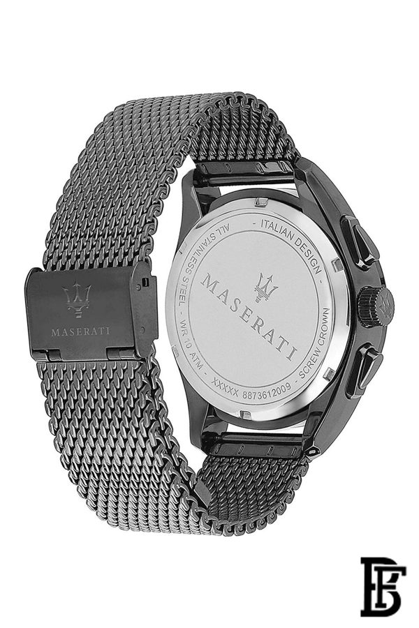Maserati Watch R8873612009 TRAGUARDO Man Blue Steel This Maserati R8873612009 watch is designed for Men has a Steel case with a circular shape and Blue color. The strap is Steel Gun metal smoke and the bezel color Gun metal smoke. The crystal is Mineral the Quartz movement and the Analog display. It belongs to the collection TRAGUARDO. You can submerge up to 10 Bar. Among its functions the following stand out: Chronograph. It has a Modern style. Diameter: 45MM