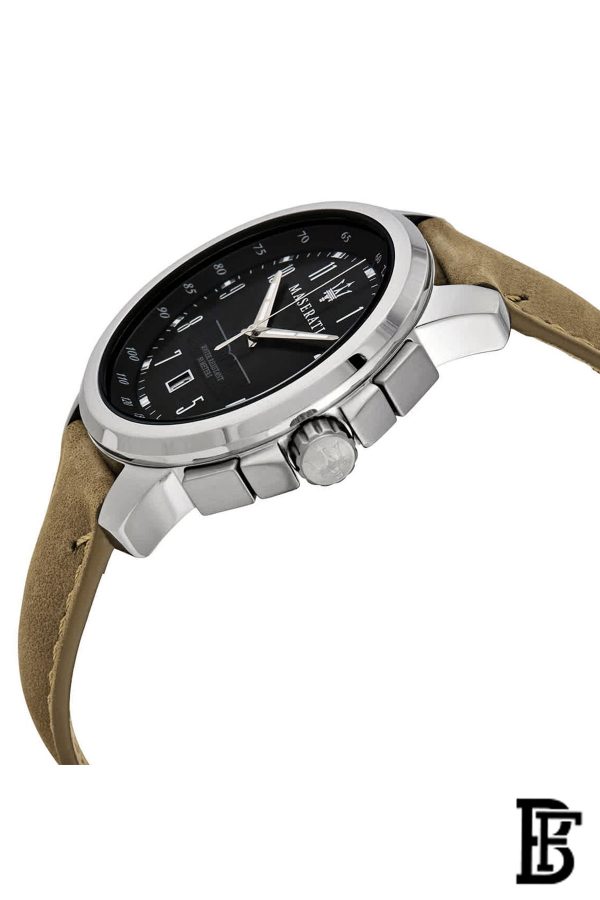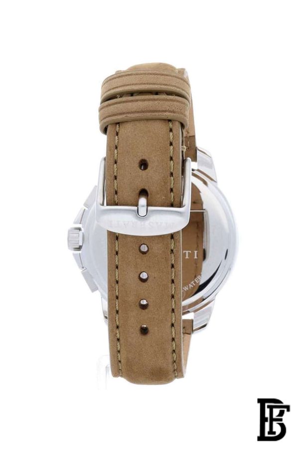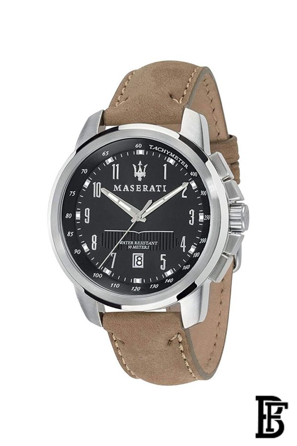 العلامة التجارية مازيراتي نوع ساعة تناظرية مادة السوار Nubuck رقم الموديل R8851121004 حركة كوارتز عرض التاريخ إطار متباين عقارب وعلامات فضية تفاصيل الشعار على القرص