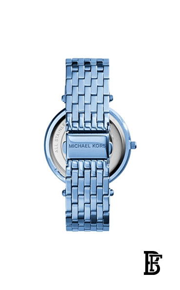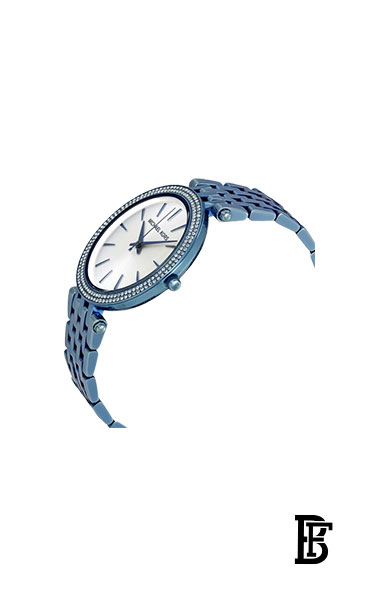 علبة وسوار من الفولاذ المقاوم للصدأ مطلي بالأيون السيرولياني. إطار ثابت مطلي بالأيون السيرولي مرصع بالكريستالات.