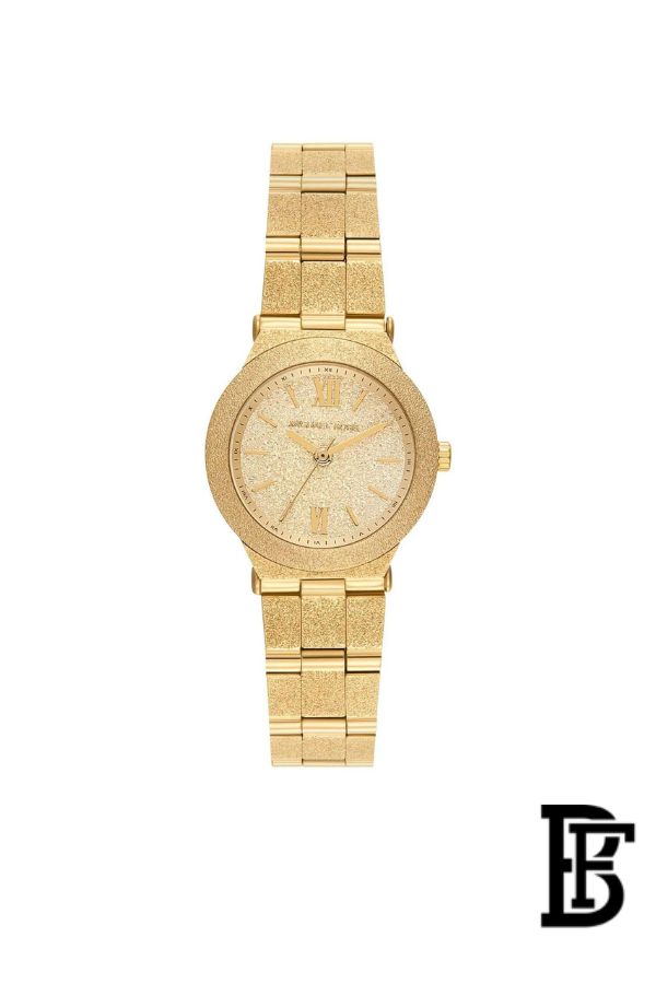 تتميز الساعة بميناء ذهبي بلمسة Brushed أنيقة، محمي بزجاج شفاف عالي الجودة. تعمل بحركة كوارتز ثلاثية العقارب لضمان دقة الوقت، مما يجعلها مثالية للاستخدام اليومي.