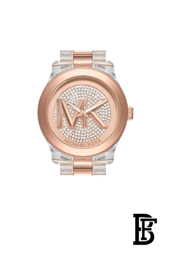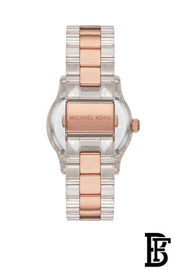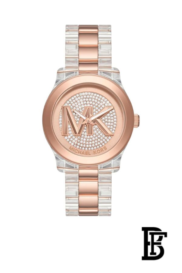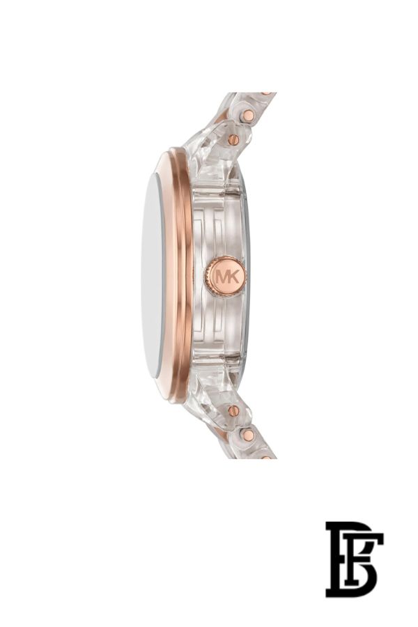 يتميز المينا بشعار MK مرصع بتصميم بافيه لامع يمنحها طابعًا أنثويًا جذابًا، بينما يوفر السوار المعدني المزود بإغلاق محكم (Deployant Clasp) ثباتًا وراحة أثناء الارتداء. تعمل بحركة كوارتز دقيقة لضمان أداء ثابت وموثوق.