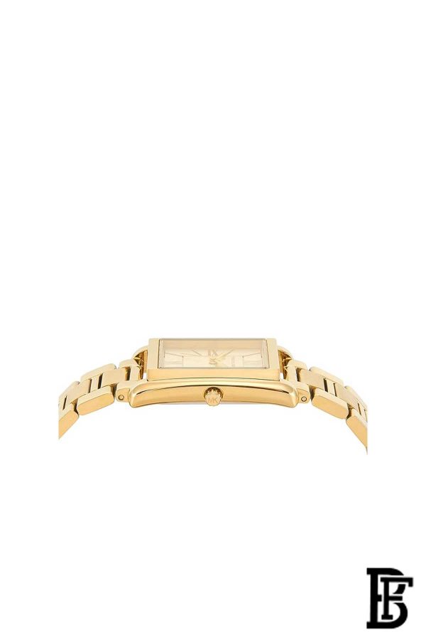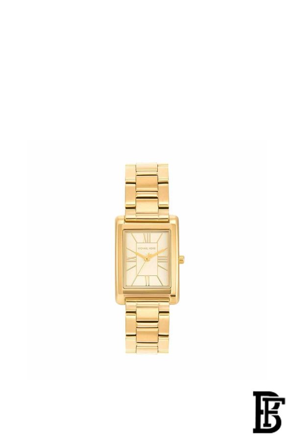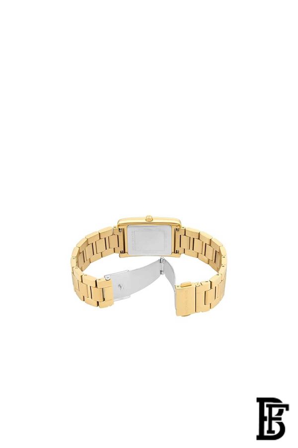 Rose gold-tone stainless steel case and bracelet. Fixed rose gold-tone bezel set with crystals. White dial with gunmetal hands and Roman numeral hour markers. Dial Type: Analog. Quartz movement. Scratch resistant mineral crystal. Pull / push crown. Solid case back.