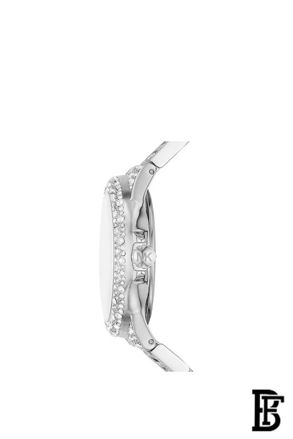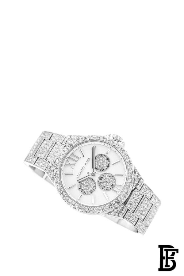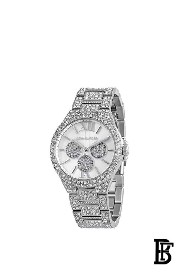 From the Camille Collection. Michael Kors' Camille 42mm watch features a pearlized white dial with silvertone stick indexes, silvertone stingray pavé case and topring, multifunction movement and stingray pavé stainless steel bracelet.|