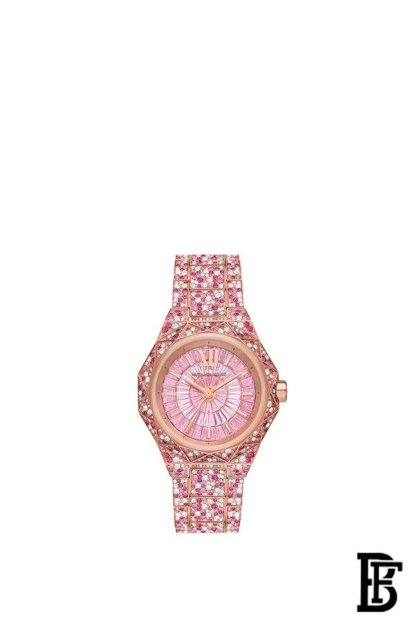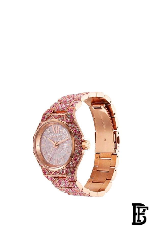 ساعة مايكل كورس راكيل النسائية ذات العقارب الثلاثة والكريستال، مينا وردي، سوار من الفولاذ المطلي بالذهب الوردي – MK7343