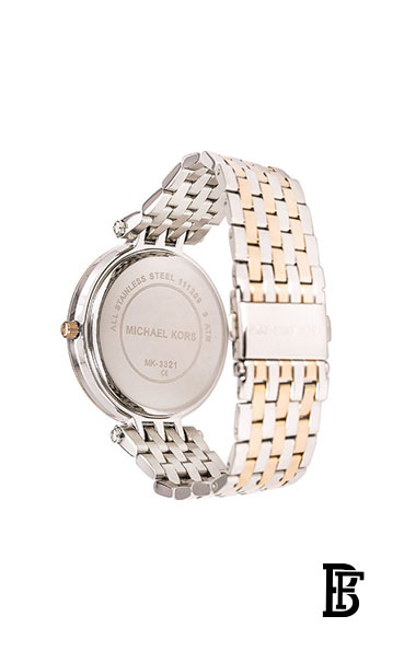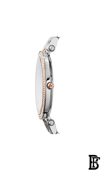 تتميز ساعة مايكل كورس مقاس 39 ملم بمينا من عرق اللؤلؤ مع حلقة علوية مرصوفة وحركة ثلاثية العقارب وسوار من الفولاذ المقاوم للصدأ بلونين.