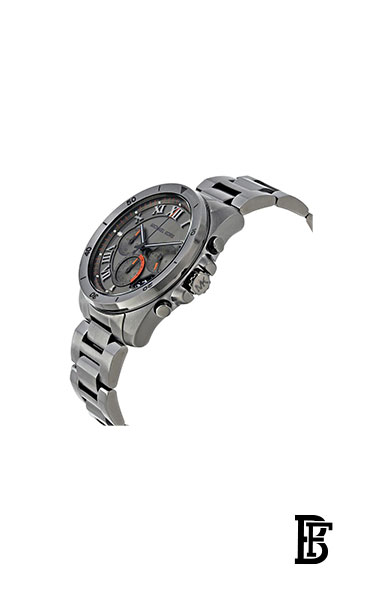 Stainless steel case. Choose from stainless steel or silicone band. Three-hand analog display with quartz movement. Date display window. Chronograph sub-dials. Water resistant 10 ATM/100 meters. Fold-over clasp closure with push-button release. Imported.
