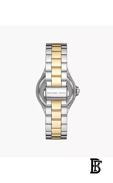 Michael Kors' 37mm Lennox watch features a gold sunray dial with white indexes, silver-tone case with a faceted gold-tone pavé topring, three-hand movement and stainless steel bracelet with gold-tone center links.