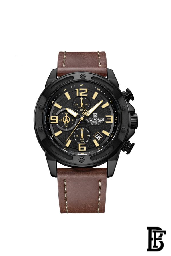 Brand: Naviforce Model Number: 9144 B-Y-D.BN Analog-Digital Display Quartz Movement Chronograph Case Material: Zinc Alloy Band Material: Leather Crystal Material: Mineral Glass Band Color: Brown Bezel Color: Black Type of Closure: Buckle Water Resistant: 30 meters Date display Alarm