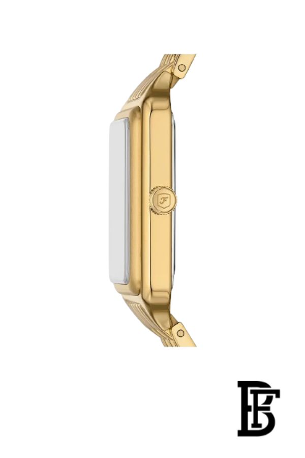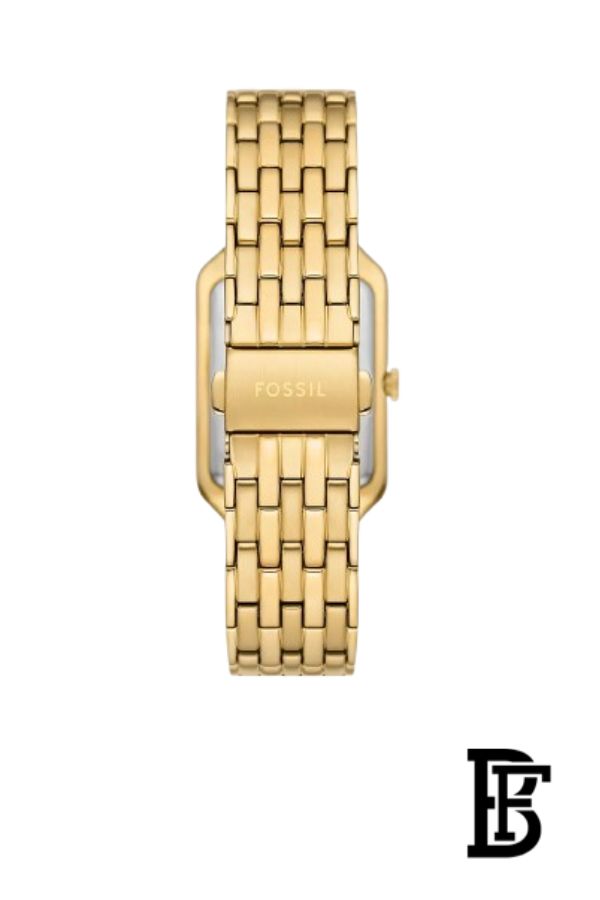 The Raquel three-hand date watch features a refined rectangular design crafted in gold-tone stainless steel. With its elegant dial and practical date function, this timeless timepiece adds a touch of classic sophistication, making it perfect for everyday wear as well as special occasions.