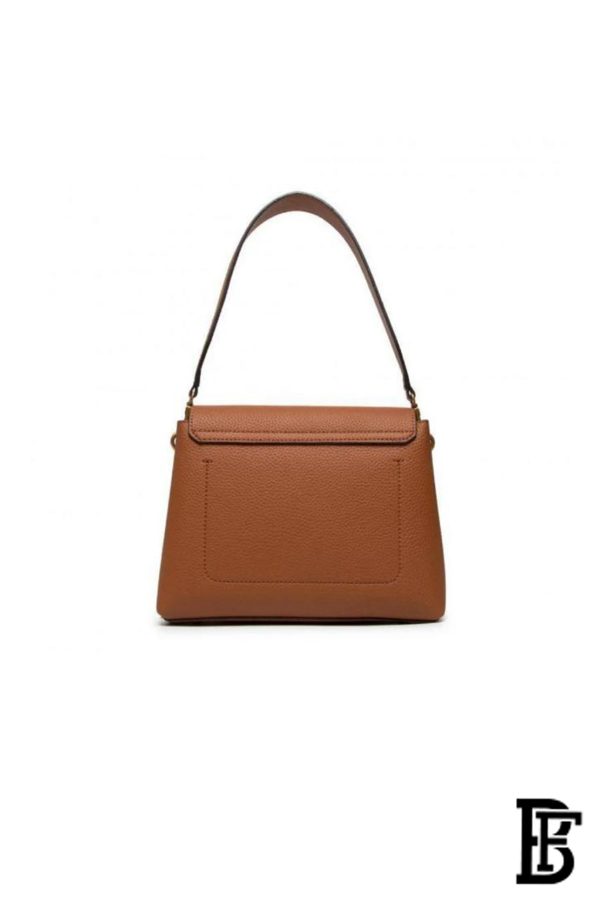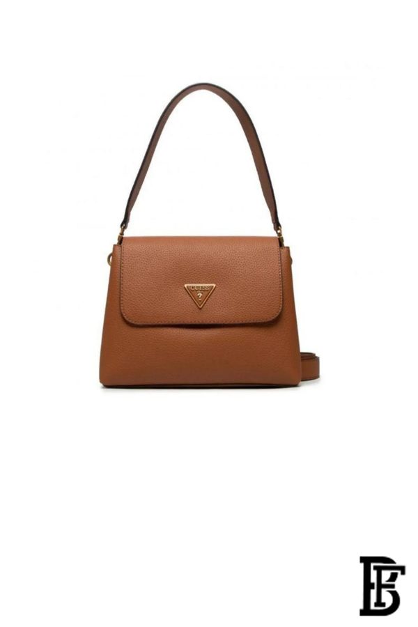 حقيبة كتف أنيقة من تصميم GUESS، مصنوعة من جلد صديق للبيئة عالي الجودة. موديل بملمس حبيبي، يبرز بتفصيل شعار مثلث على الغطاء.