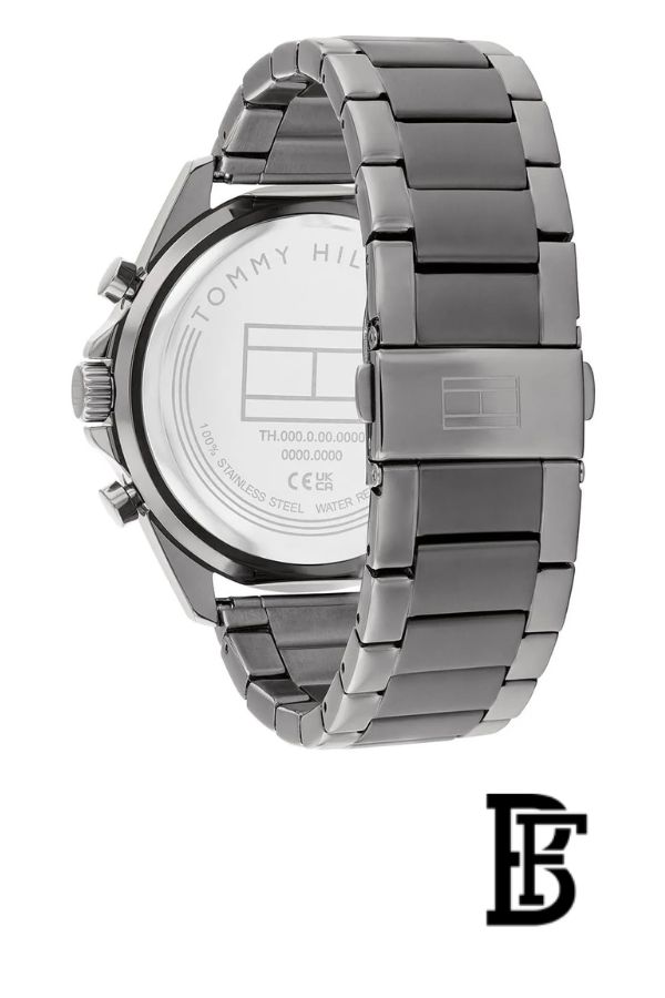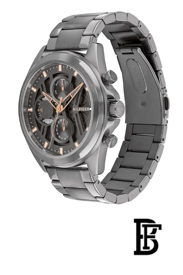 Introducing the Tommy Hilfiger men's watch—a bold statement of sporty sophistication. At its core lies a dimensional double-layer dial, a striking visual masterpiece that captures the essence of boldness and innovation. Oversized hands dominate the face, adding a touch of rugged charm to its athletic-inspired design. Sub-eyes positioned at 12, 6, and 9 o'clock offer multifunctional versatility, while stamped gear detail at the 4 o'clock position. It is a multifunction dial, featuring weekday, 24-hour, and date sub-eyes. Crafted for the modern man who embraces adventure and dares to stand out, this timepiece exudes confidence and unparalleled style.
