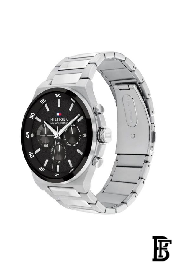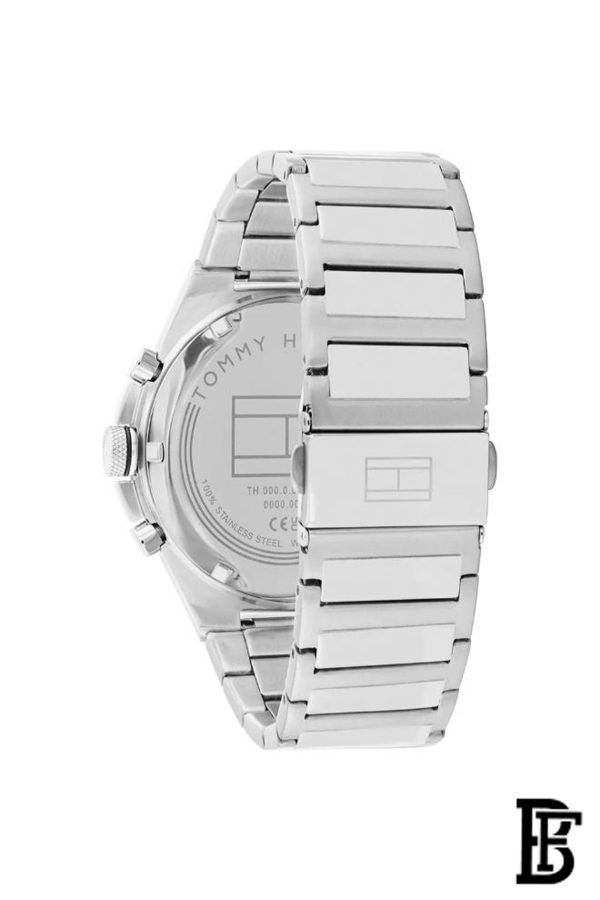 This Tommy Hilfiger watch has a case made of stainless steel with a diameter of 46 mm and is fitted with a metal band. movement and the watch features a Mineral crystal.The watch is 5 ATM. This means the watch is suitable for showering.