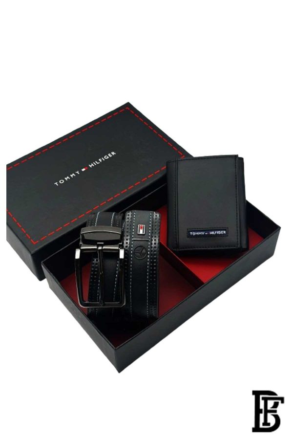 طقم تومي هيلفيغر عبارة عن محفظة رجالي وحزام أسود كلاسيكي