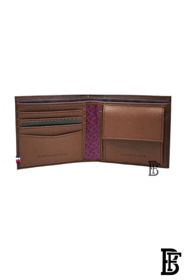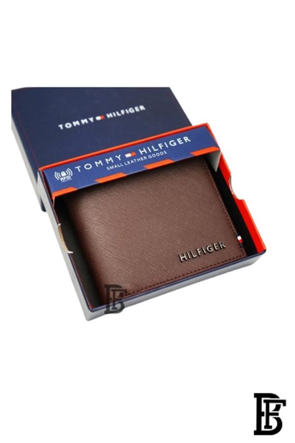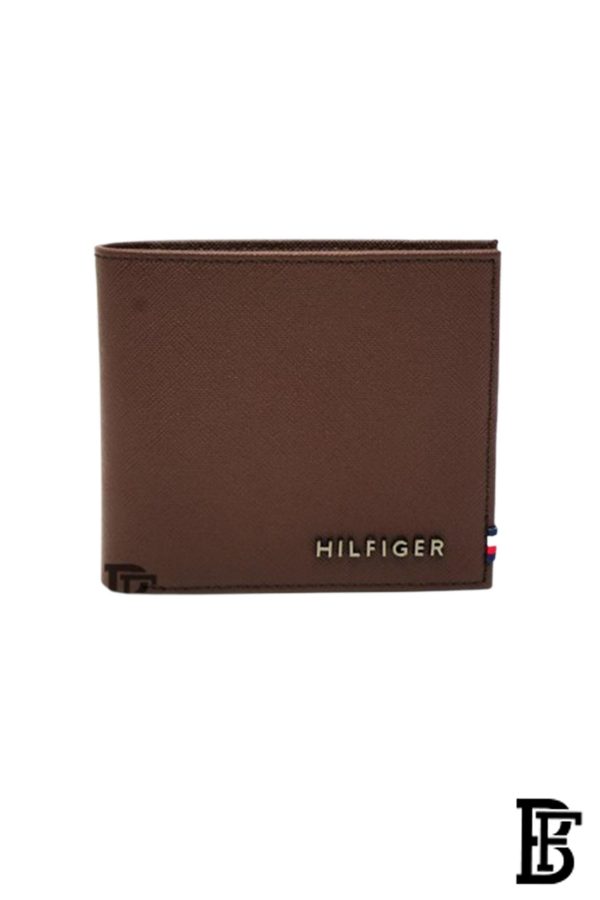 محفظة Tommy Hilfiger هي تصميم متين وجهاً لوجه مغطى بالجلد الفاتح/البني
